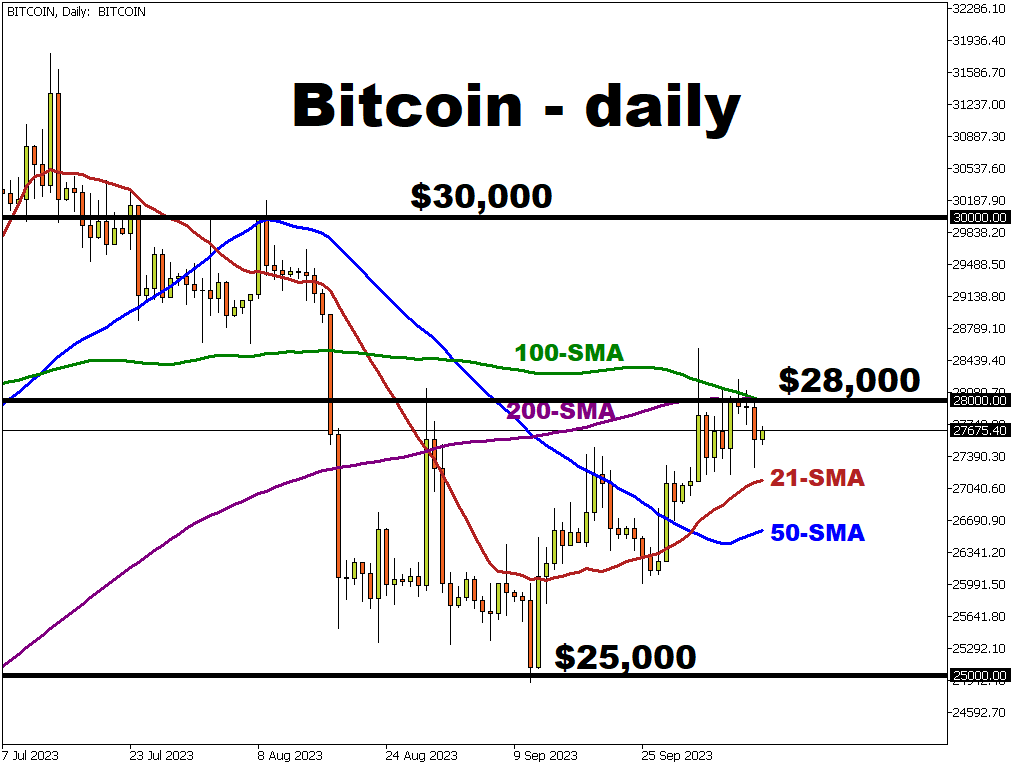 The world’s most popular cryptocurrency eventually pushed up above its 50-day simple moving average around $26,700 in late September, after failing to do so a week earlier.