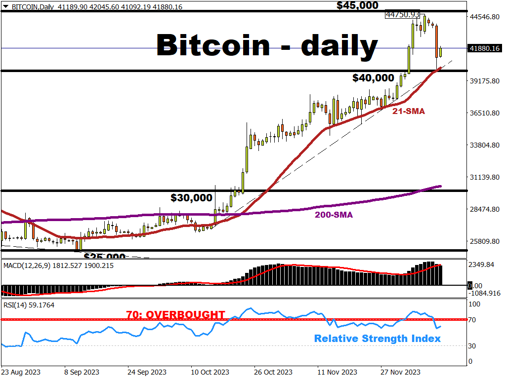 Bitcoin fell by almost 6% yesterday (Monday, December 11th), though found support around the psychologically-important $40,000 line, as well as around its 21-day simple moving average (SMA).