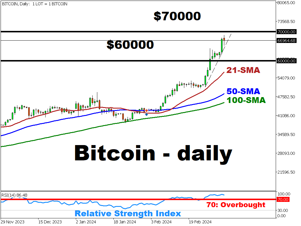 - Key resistance lies at an all-time high ($70,000), a psychological barrier that could propel the price further upwards if broken. Support sits at $60,000