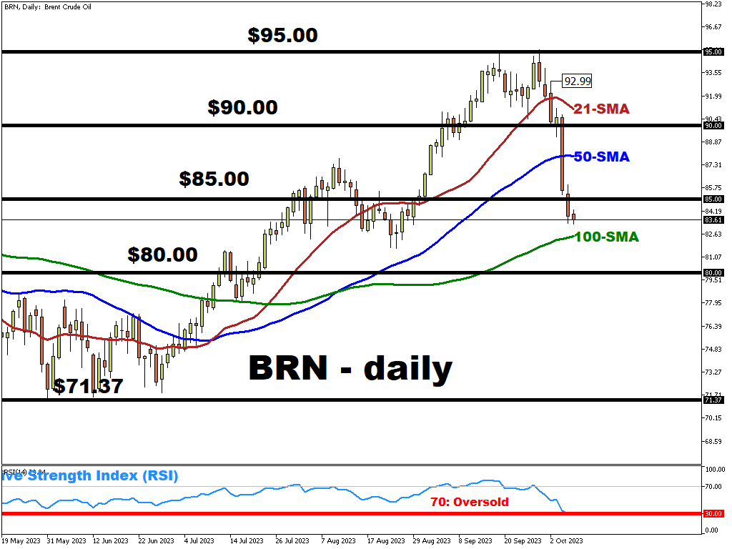 After the sharpest single day drop (-5.48% on Oct. 2) in Oil prices this year, BRN bulls are attempting to stabilize around $83/bbl.