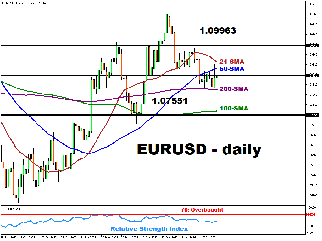 - A more dovish tone could potentially push the EURUSD towards or even below the 200-period SMA (~1.084395)