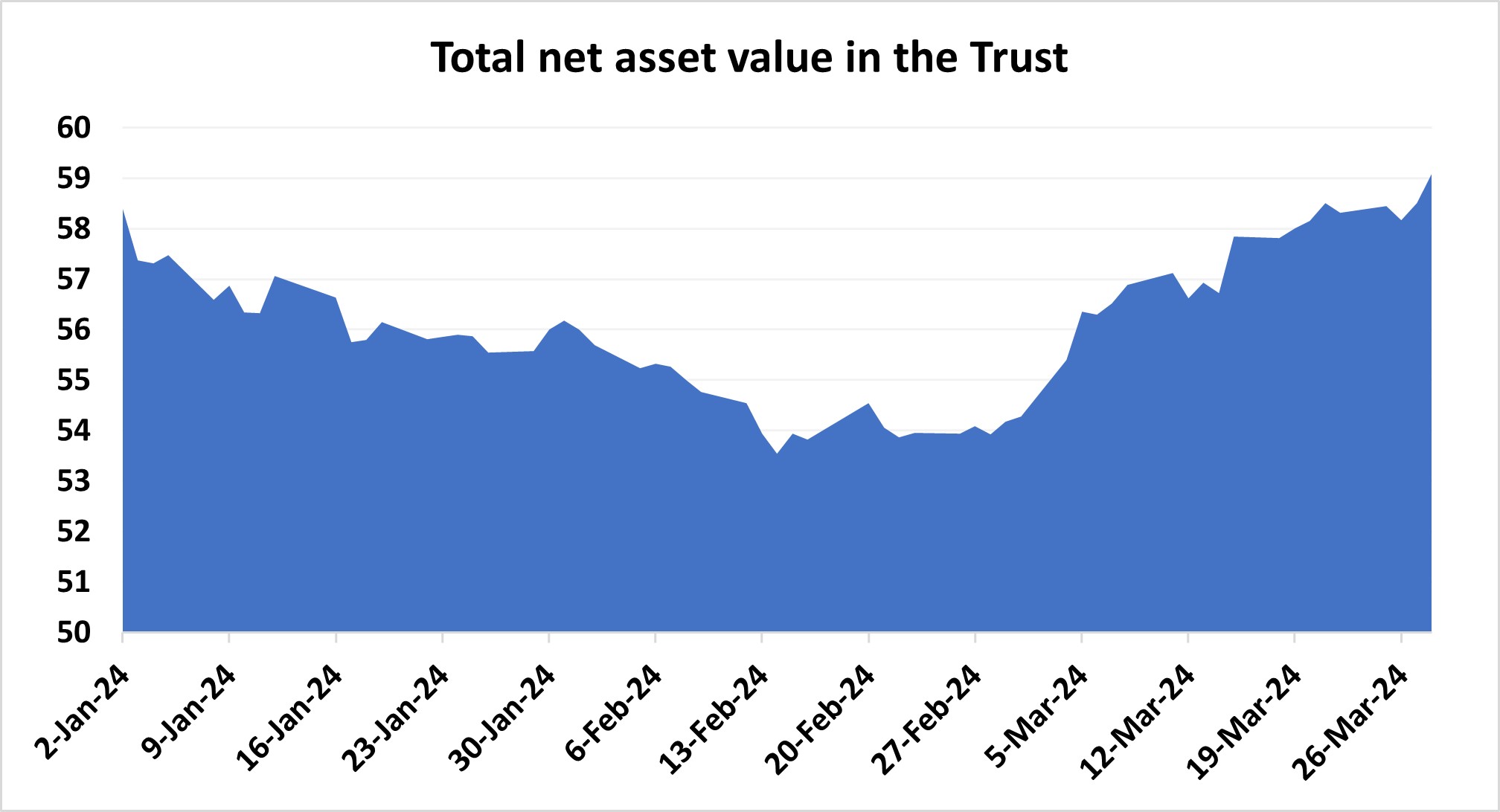 During the period of 25.03-28.03.2024 the total net asset value of the world’s largest gold ETF (SPDR Gold Shares) has posted a 1.1% increase, bringing the total value up to $59.1 billion.