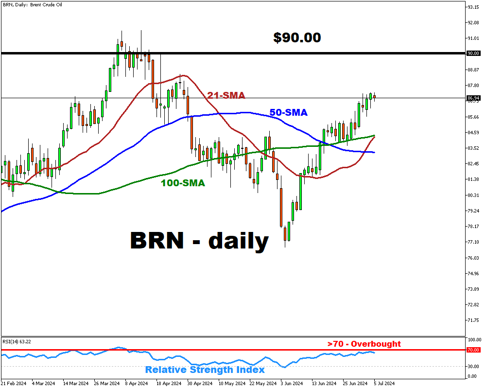 Brent is holding around a fresh 2-month high, with oil bulls emboldened by the threat of Hurricane Beryl amplifying US supply risks.