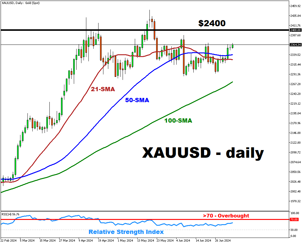 Gold is set to move closer to $2400 upon further signs of softening in the US labour market, which in turn ramps up hopes for Fed rate cuts later this year.