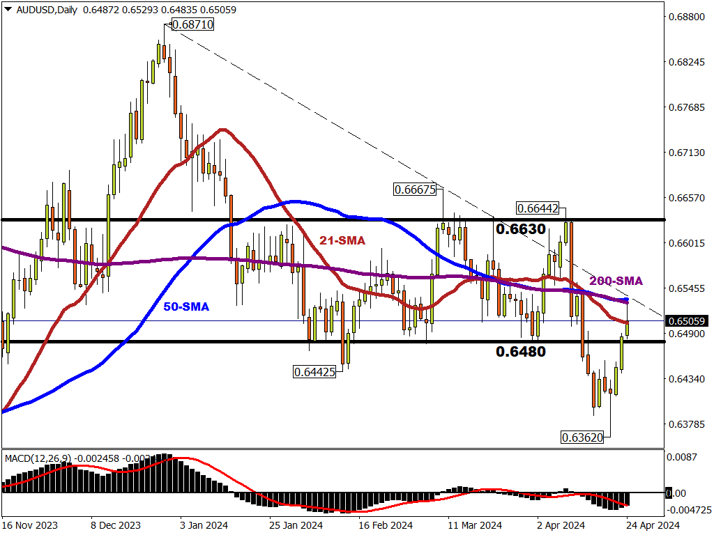Further evidence of "US exceptionalism", which forces the Fed to keep US interest rates higher-for-longer, could further boost the US dollar and force AUDUSD to falter back below 0.6480.
