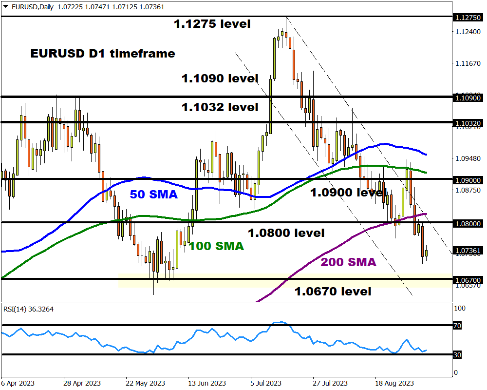 After cutting through the 1.0800 support level, euro bears were given the green light to switch into a higher gear. Prices are heavily bearish on the daily charts with the negative momentum opening a potential path towards 1.0670 – a level not hit since June 2023. For bulls to jump back into the game, a solid move back above 1.0800 needs to be achieved. Given how the Relative Strength Index (RSI) is approaching oversold regions, a rebound should not be ruled out.