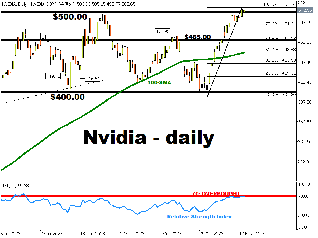 - A 7% move to the upside on Wednesday (depending first on whether this stock ends today above or below the $500 line) could see Nvidia’s stocks trading around $535 when US markets reopen.