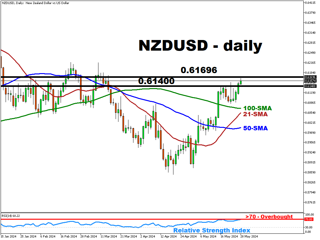 On the downside, the 0.61400 level provides immediate support, while on the upside, the 0.61696 level is the key resistance/target level for the NZD bulls.