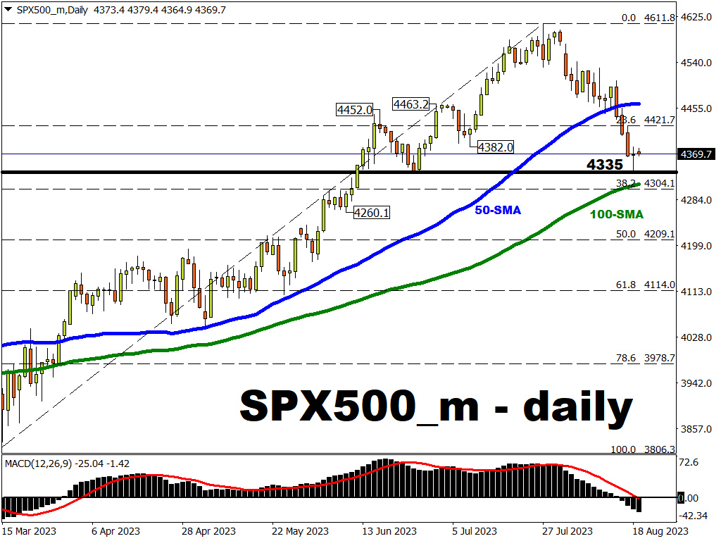 - If Chair Powell delivers a higher-for-longer message, i.e. US interest rates could go even higher and stay at that peak for longer than what markets currently expect, that could drag the SPX500_m even lower.