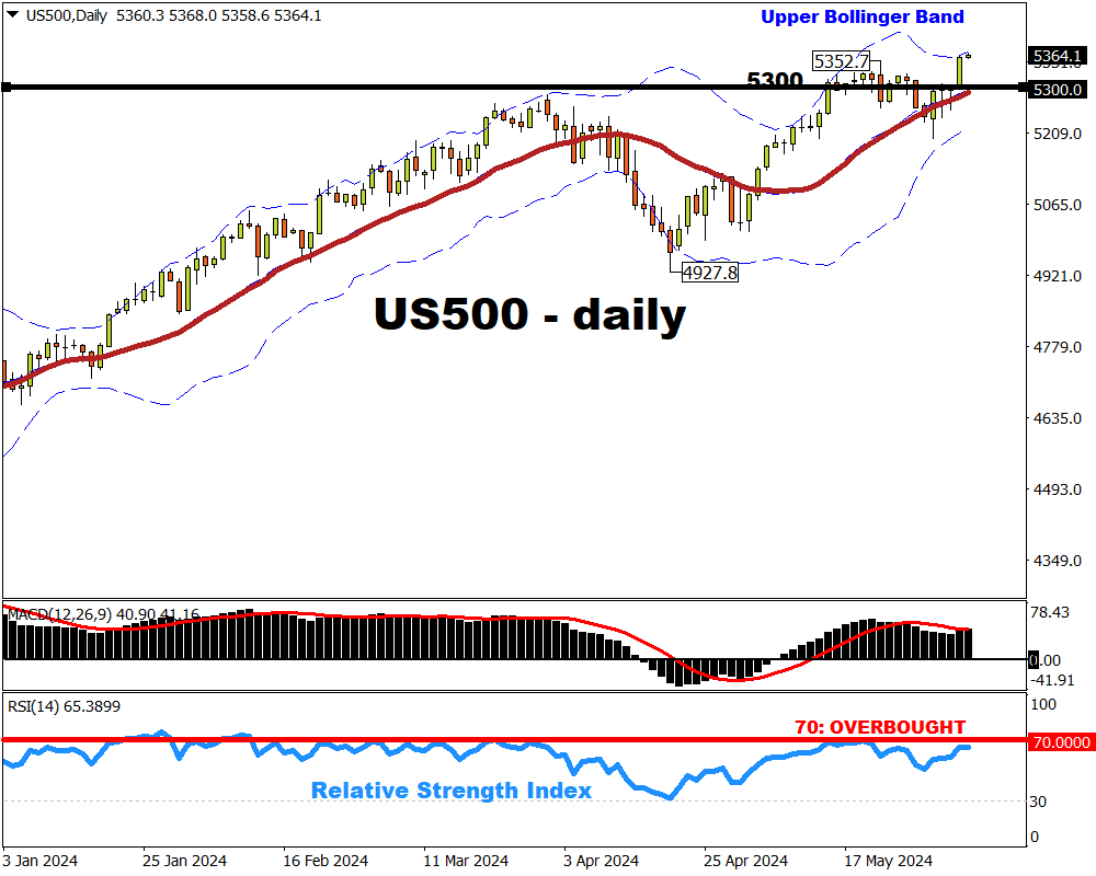 The US500 index climbed above 5360, bringing its year-to-date gains past 12%.