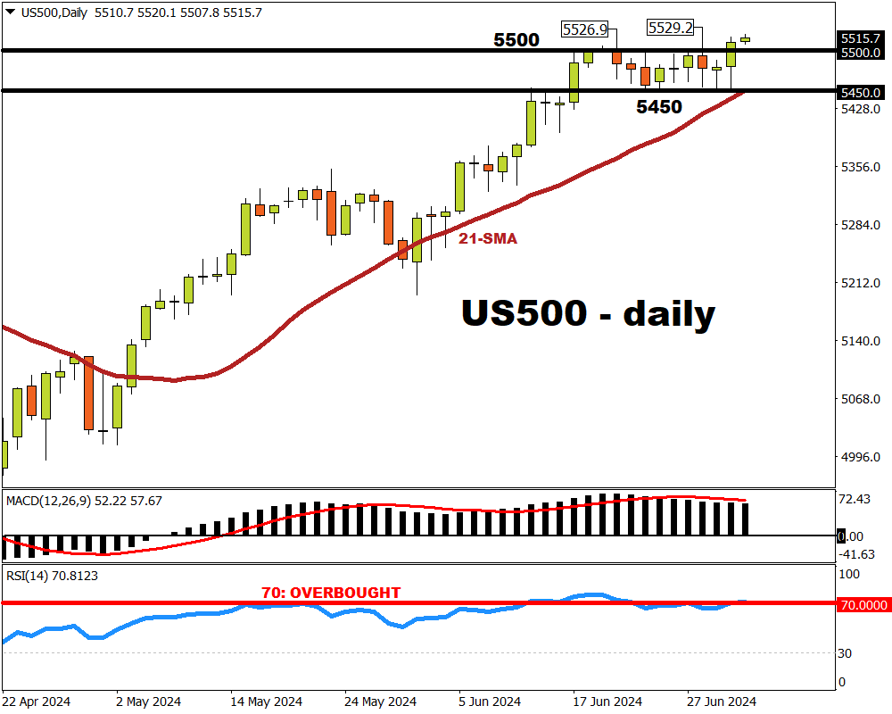 The US500’s current record high, using intraday prices, currently stands at 5529.2 as posted on June 28th.
