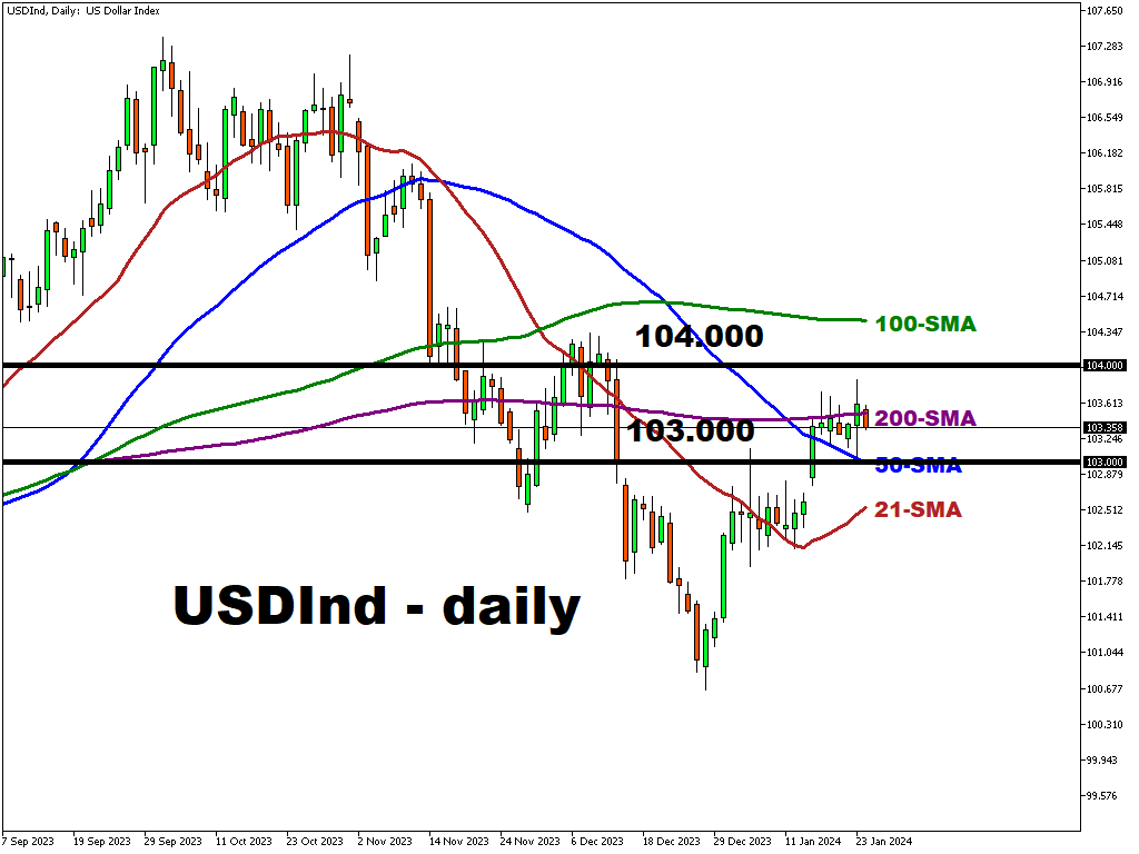 The dollar tried to move decisively to the upside yesterday after recent consolidation just below the 200-day simple moving average at 103.48 on the Dollar Index.