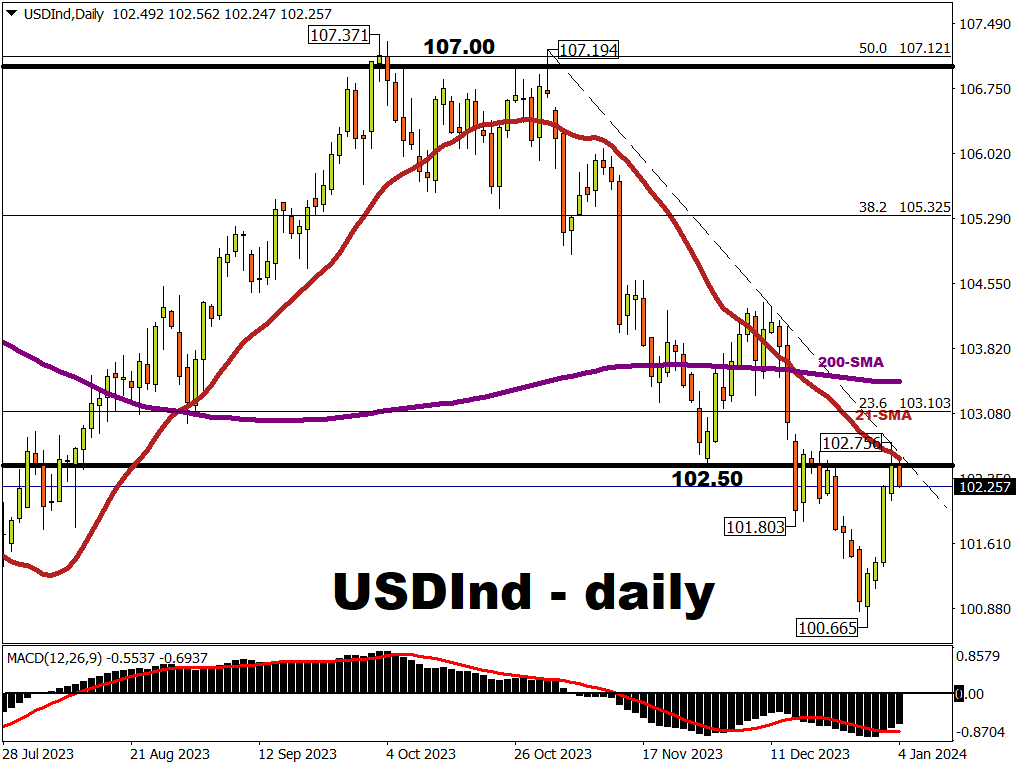 Prices closed above 102 on the USDInd, before being resisted at the top of a bear channel going back to the start of November, also where its 21-day simple moving average (SMA) currently lies.