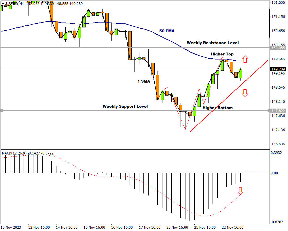 The price bounced off a weekly support level and might be heading for a potential weekly resistance level around 150.055.