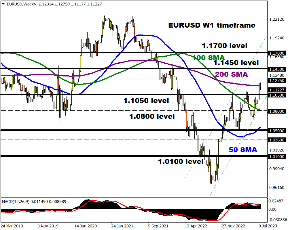 - A cautious-sounding ECB that signals a pause in hikes down the line could weaken the euro, pulling the EURUSD lower.
