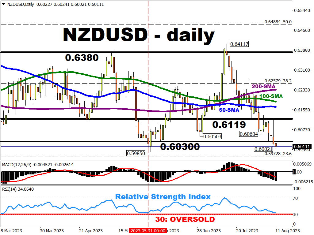 NZDUSD’s 14-day relative strength index (RSI) is flirting with the 30 mark, which denotes oversold levels.