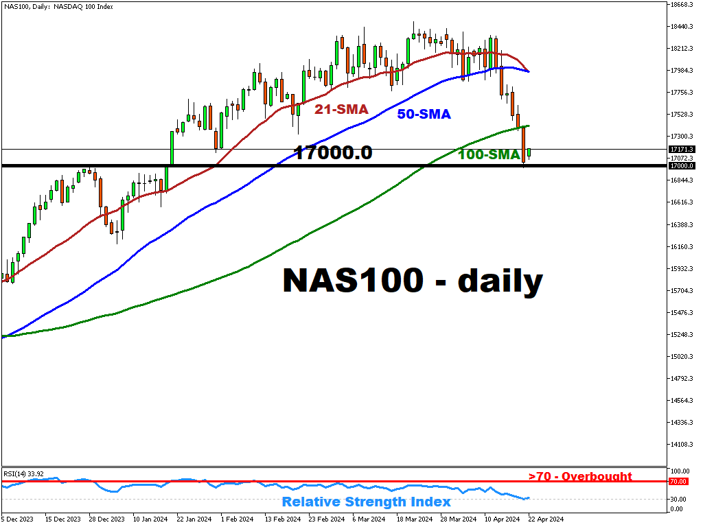 If Tesla heaps on more negative news, this stock could fall another 7-8% when markets reopen Wednesday, and drag the NAS100 closer to the 17,000 level.