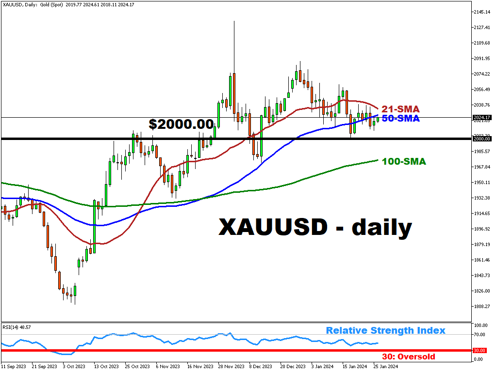 Gold edges higher, towards the 50-period SMA (~2026.828), despite higher-than-expected US’ economic performance last quarter of 2023.