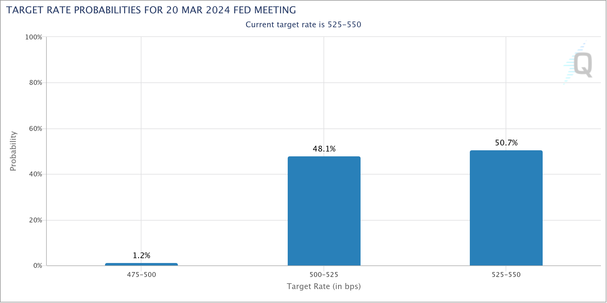 US resilient economic data did not derail the XAUUSD bulls as the markets still price in a high (48.1%) chance for a rate cut in March.