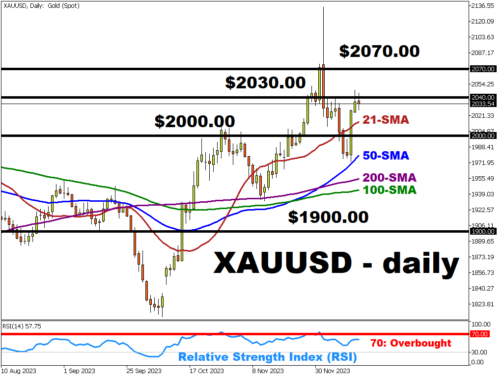 Gold has experienced a strong upward momentum, but has eased slightly to now trade around $2030, following the Fed’s policy meeting which signaled a likely end to this interest rate hike cycle.