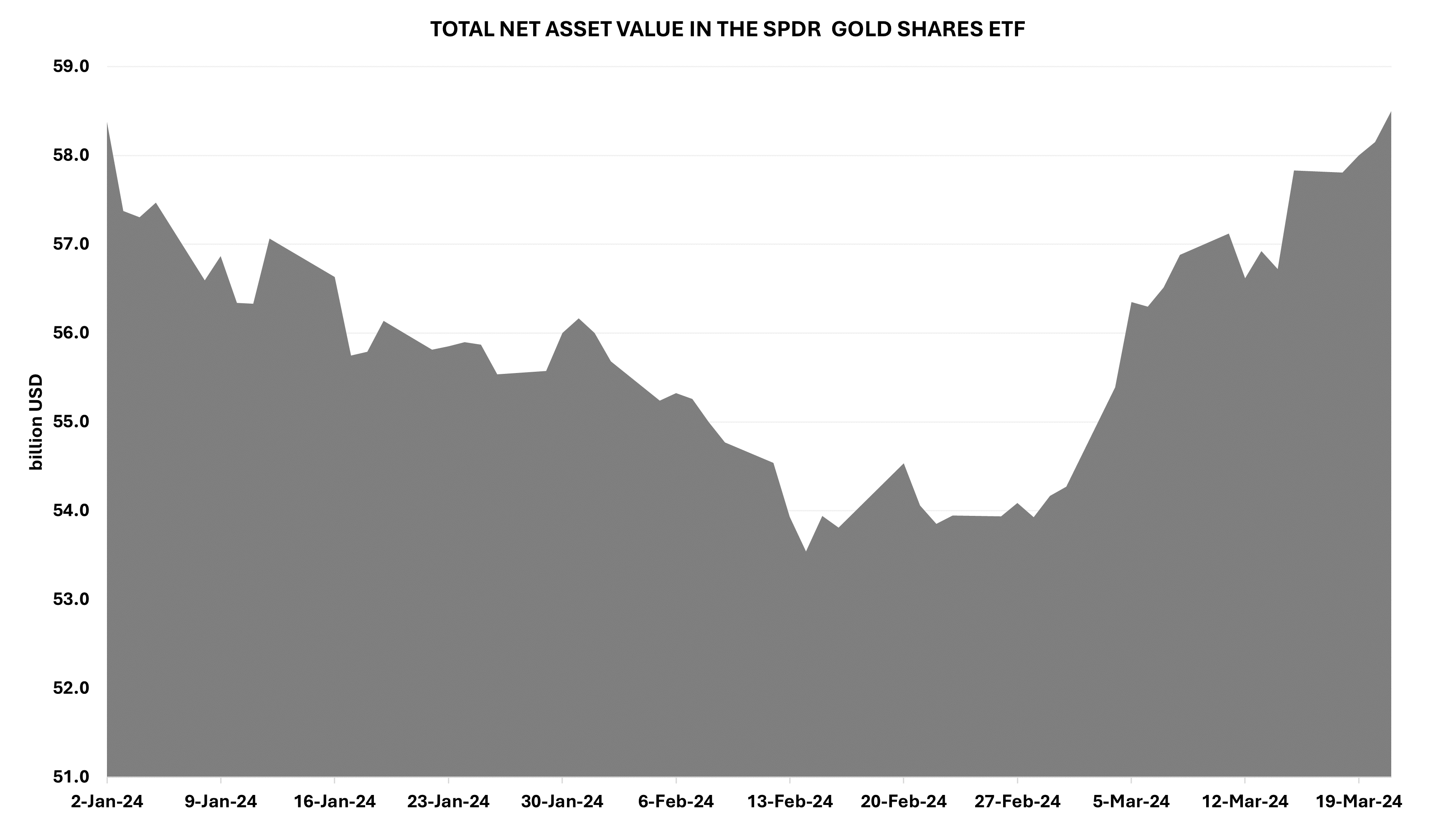 The world’s largest gold ETF (“SPDR Gold Shares”) has gained 1.2% (~$690.7 million) in total net asset value (Mar18 – Mar 21), bringing the total up to $58.5 billion.